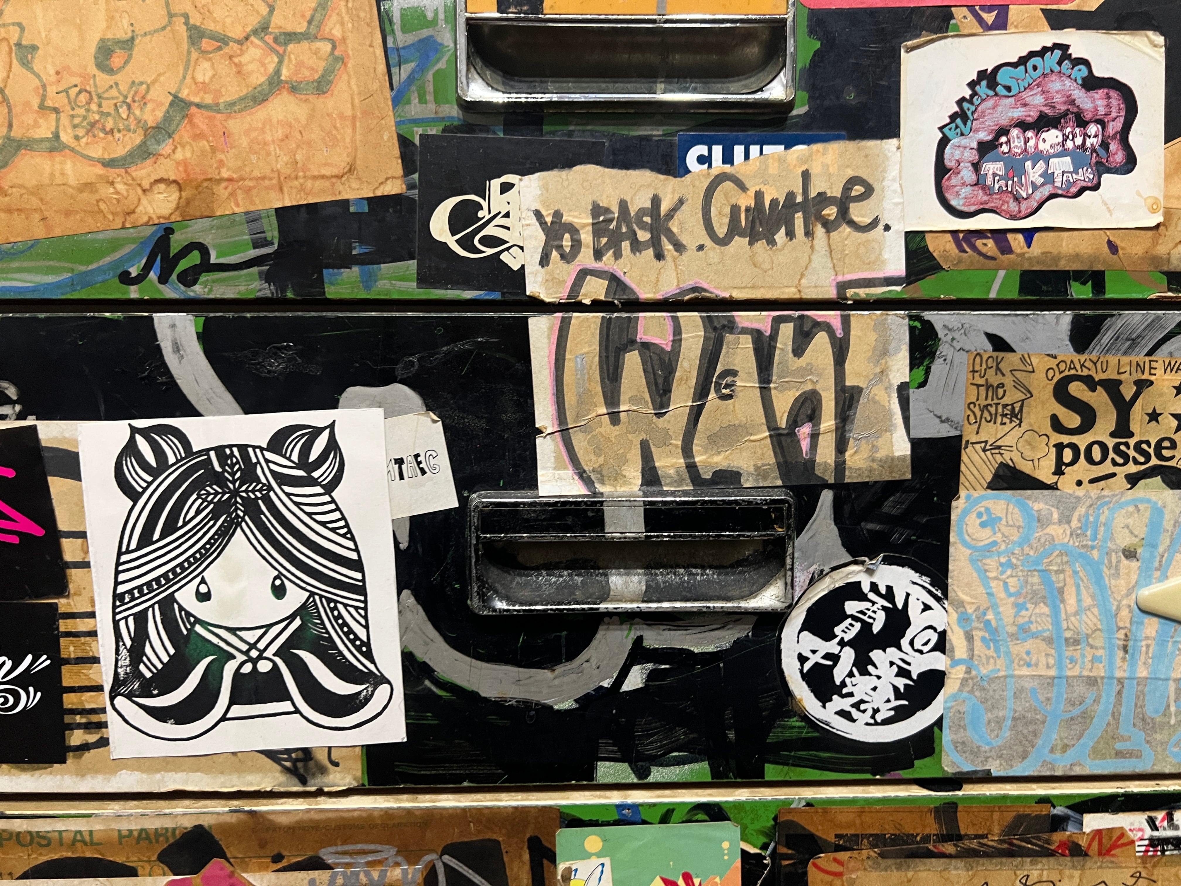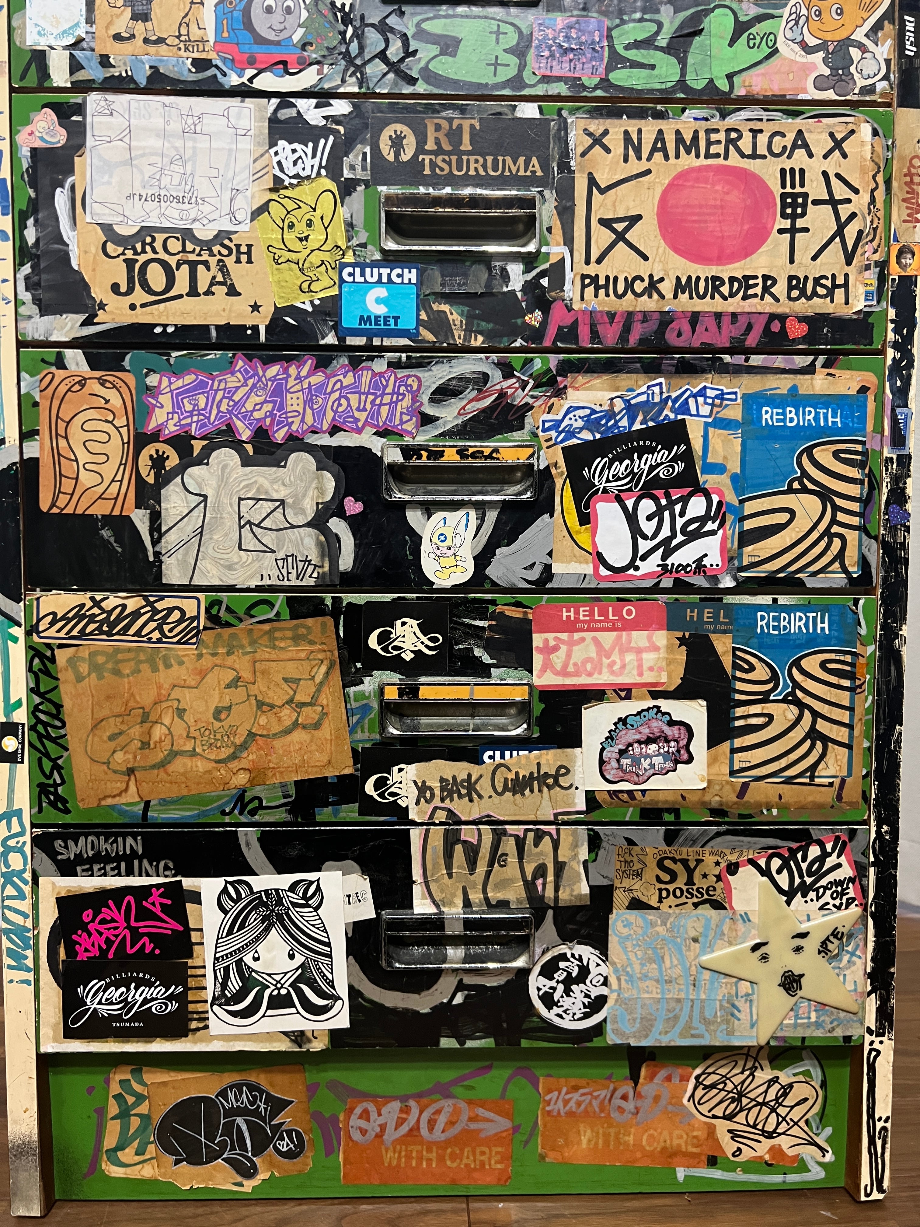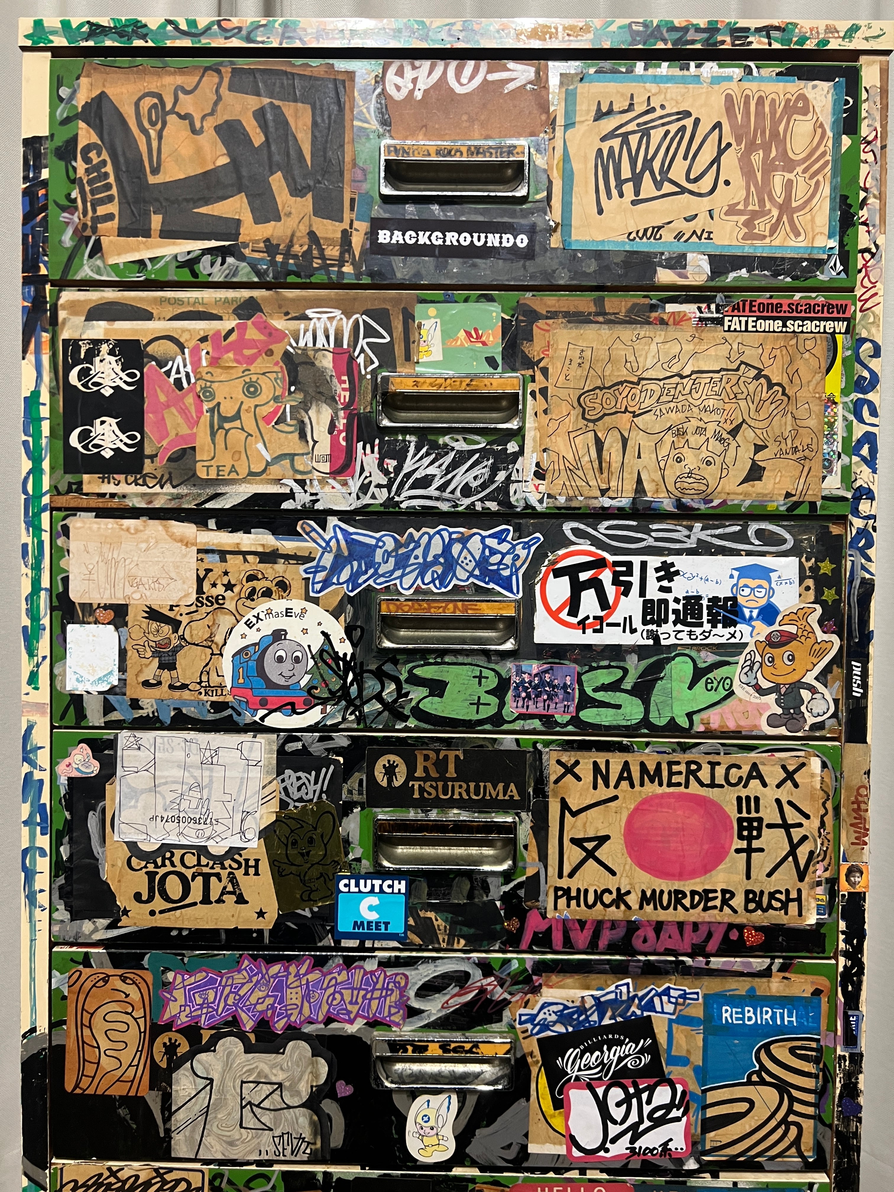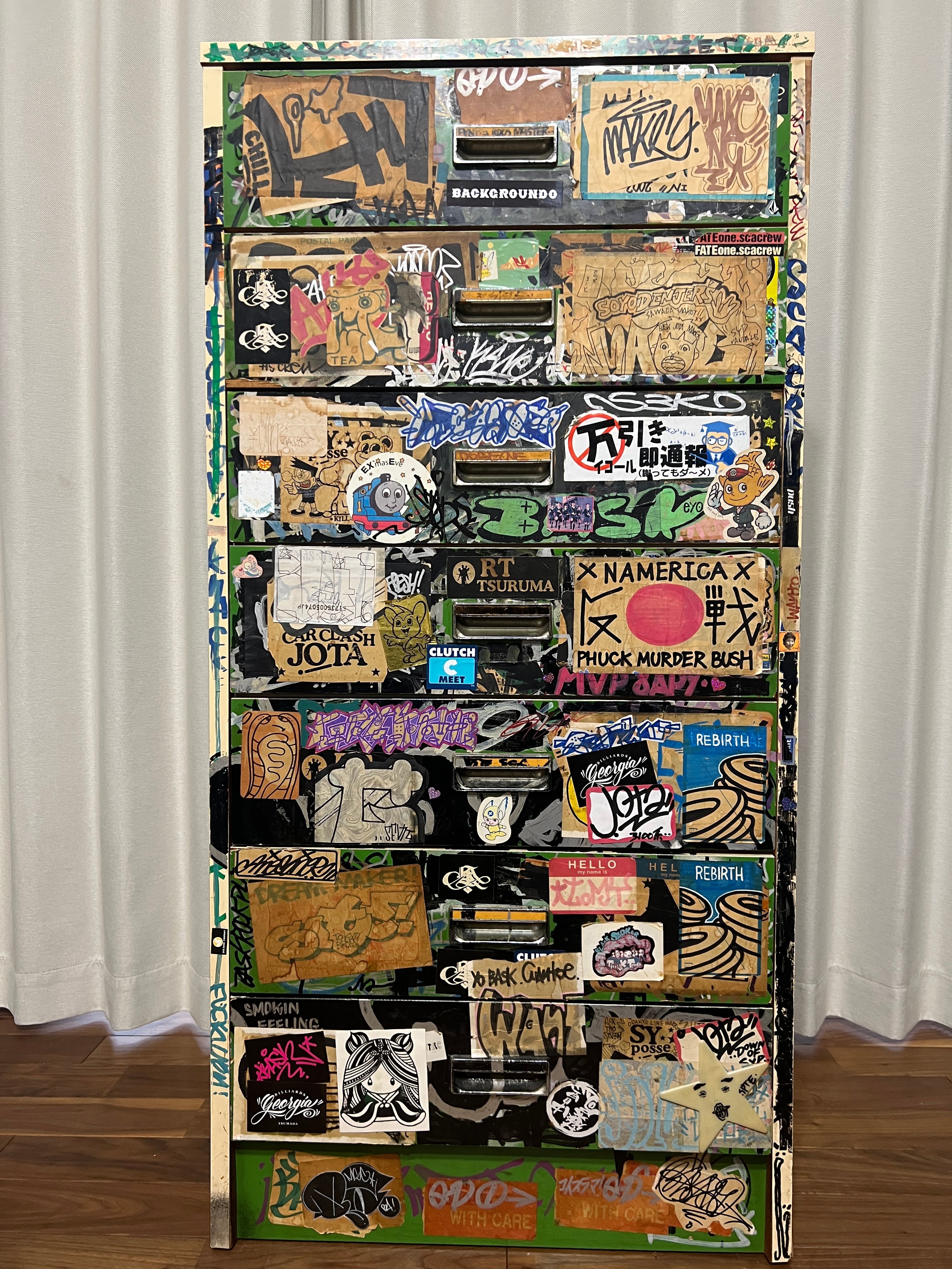 その時代にスプレー缶にマーカー、タグを描いた大量のステッカーで武装していた双子の兄弟、DOSE氏とBASK氏が96年から2004年までカスタムし、その後数々の某ヤサや某事務所を転々とし、2026年、とある某事務所が所有しているという情報をキャッチ、事務所移転に伴い譲ってもいいとの事でBACKGROUNDOが回収。四半世紀ぶりに巡り巡って DOSE氏の元へ戻ってきたビンテージ7段チェストになります。