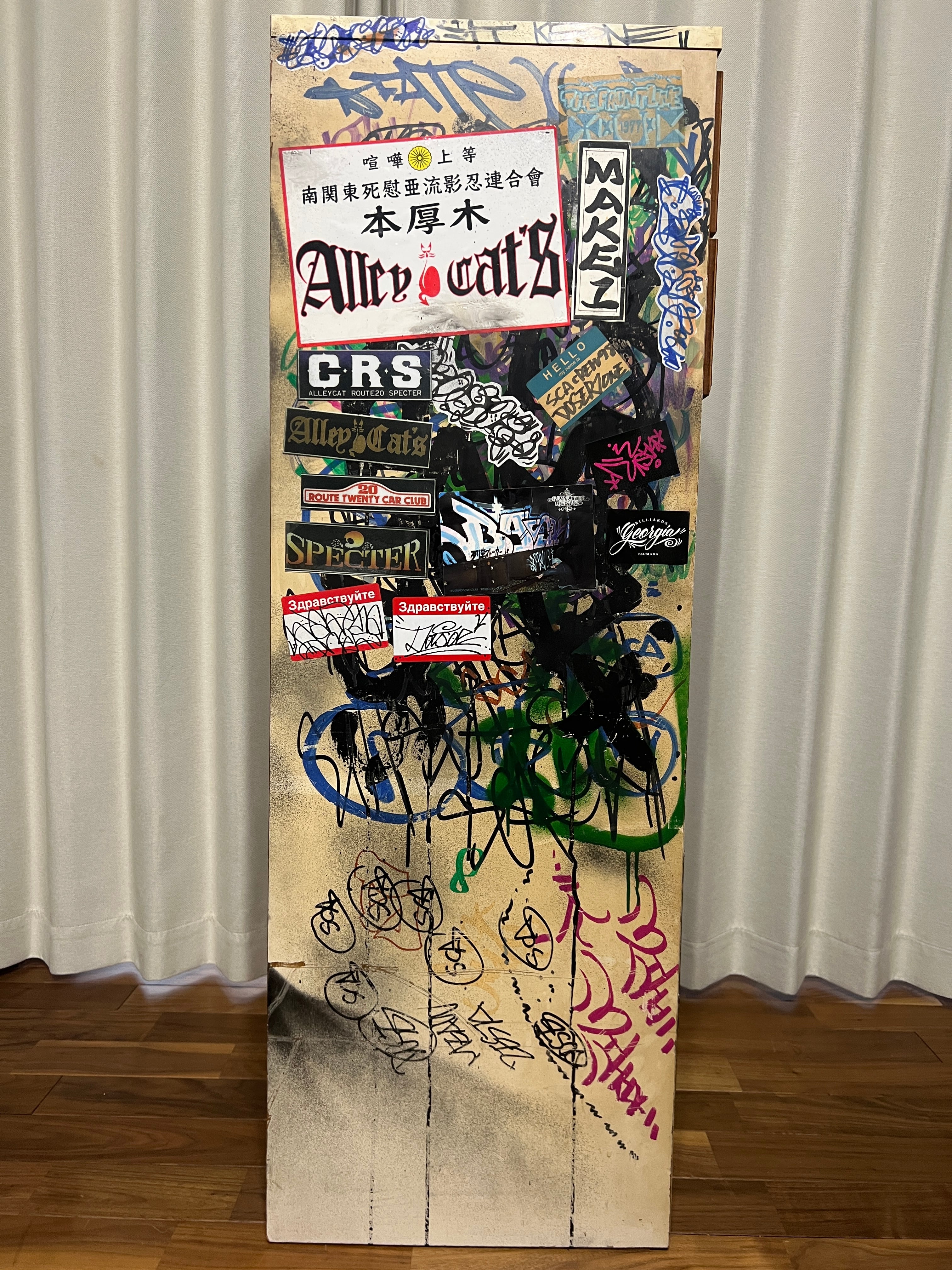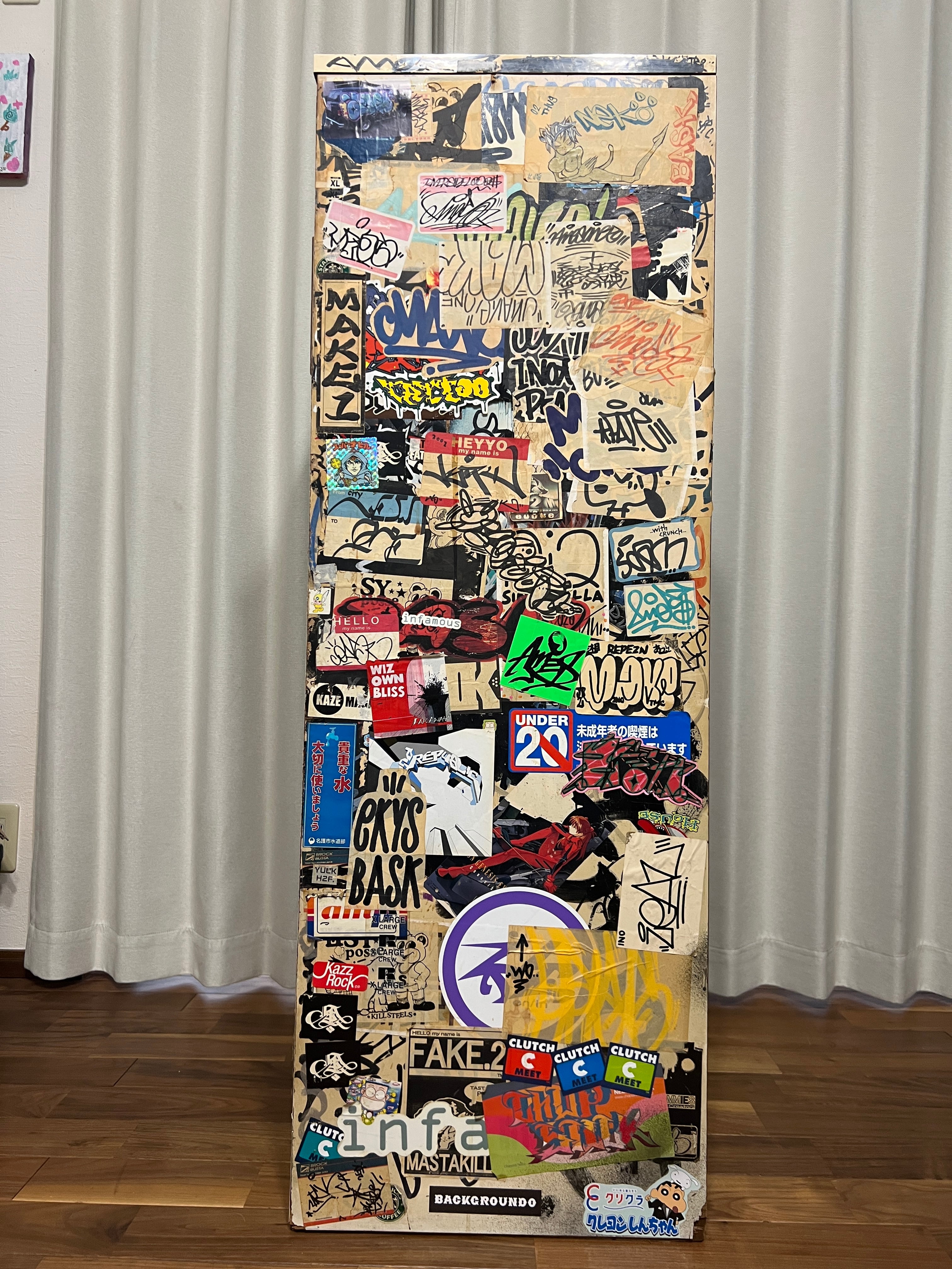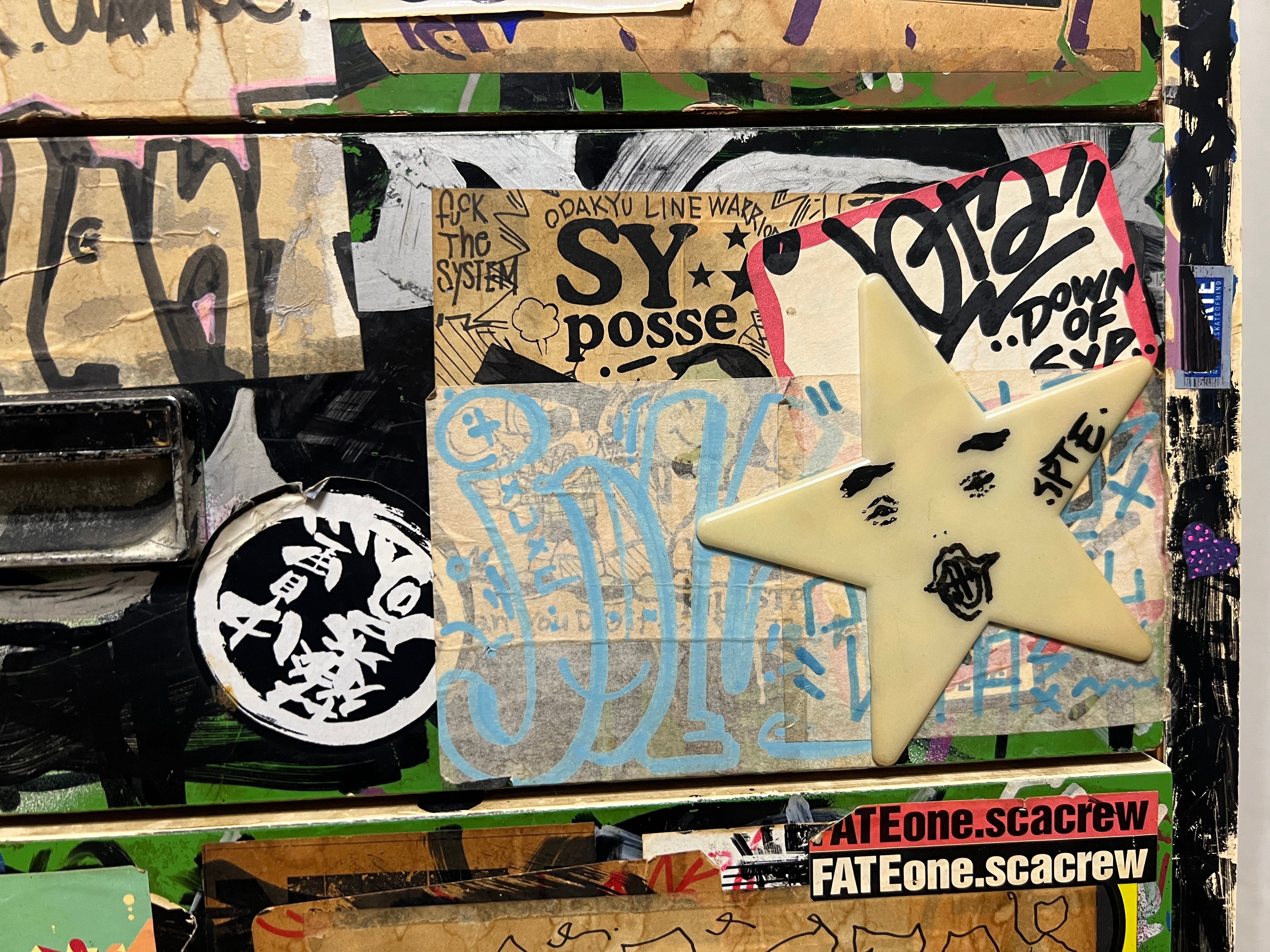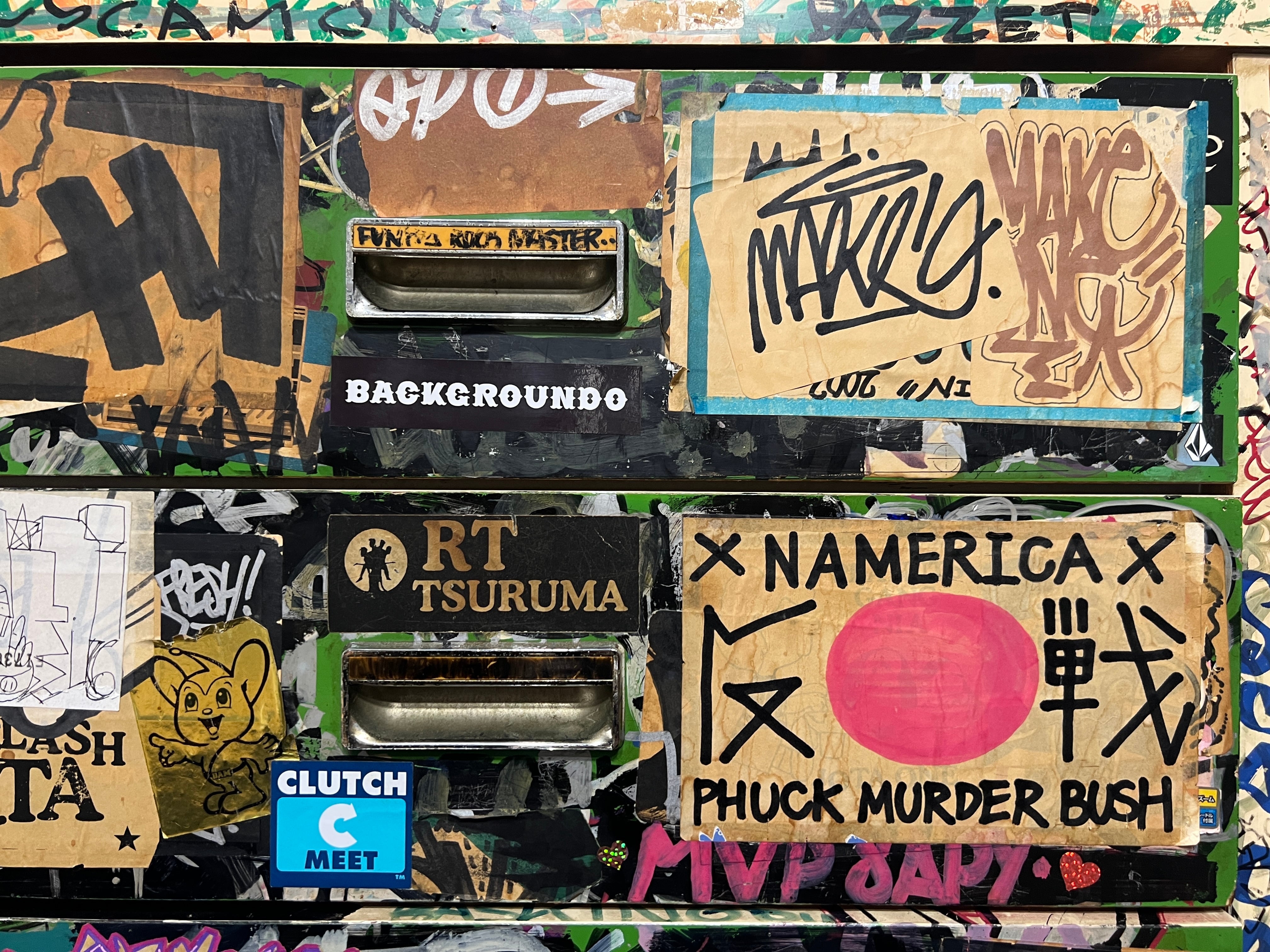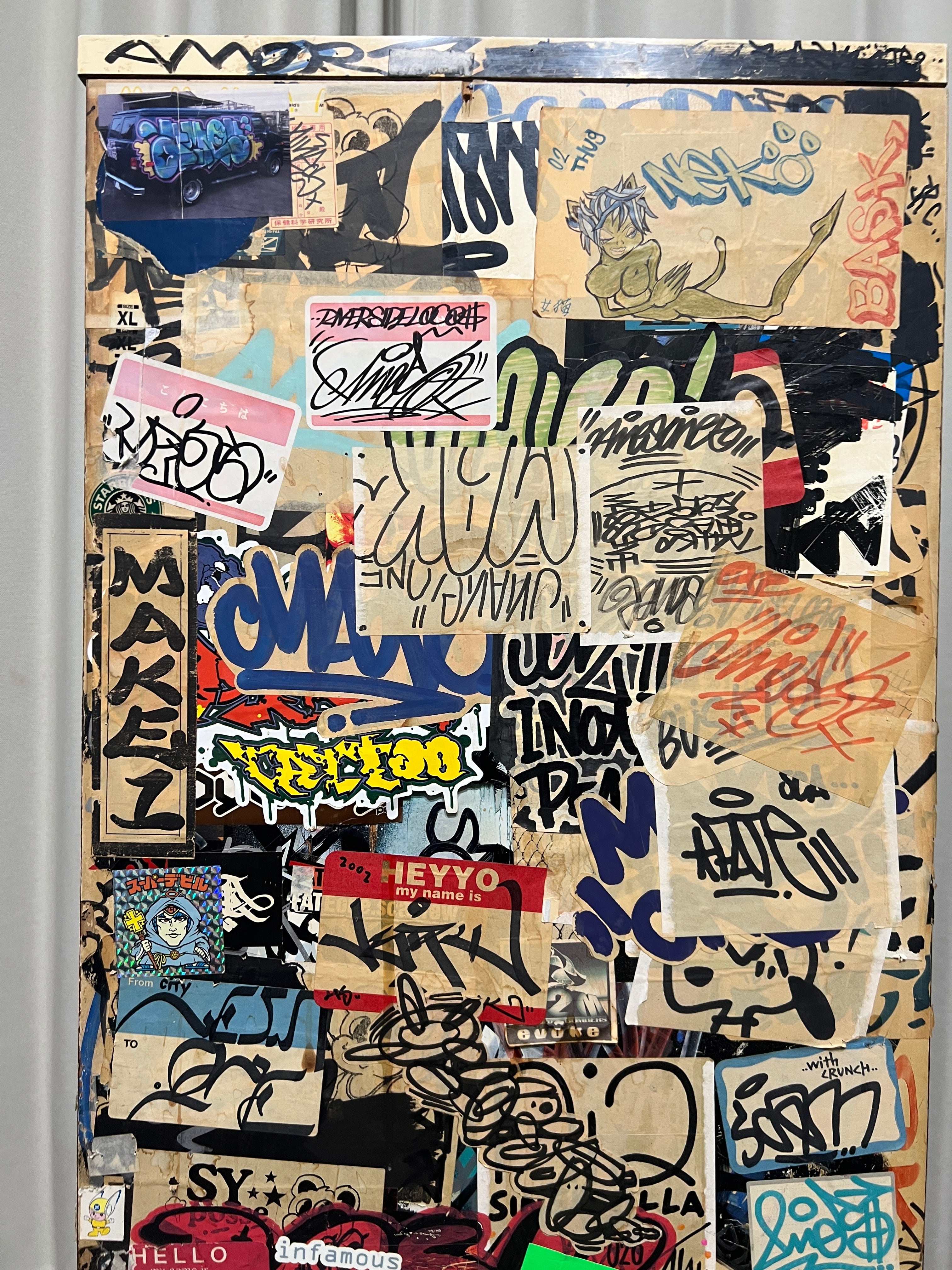 その時代にスプレー缶にマーカー、タグを描いた大量のステッカーで武装していた双子の兄弟、DOSE氏とBASK氏が96年から2004年までカスタムし、その後数々の某ヤサや某事務所を転々とし、2026年、とある某事務所が所有しているという情報をキャッチ、事務所移転に伴い譲ってもいいとの事でBACKGROUNDOが回収。四半世紀ぶりに巡り巡って DOSE氏の元へ戻ってきたビンテージ7段チェストになります。