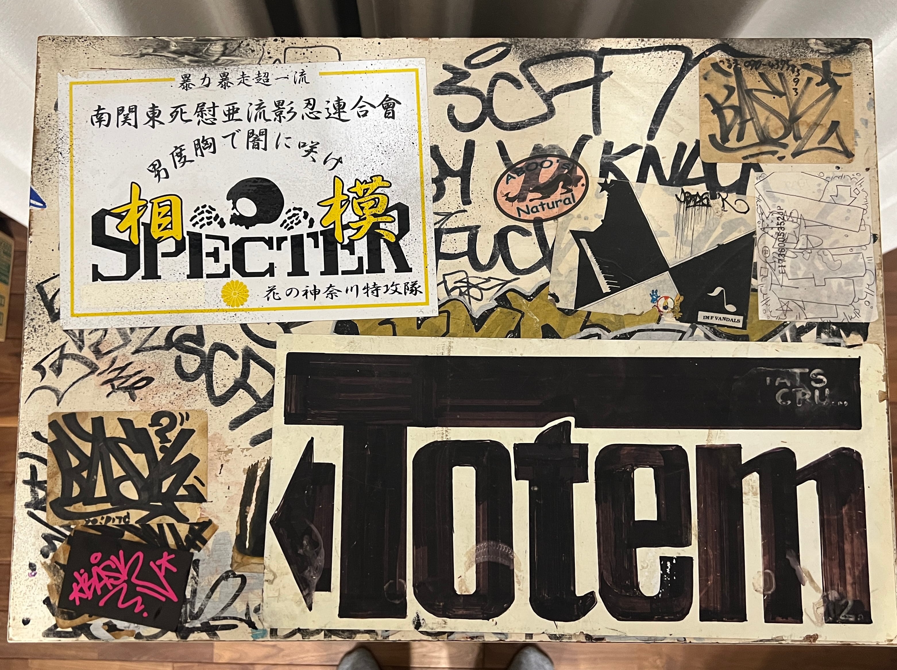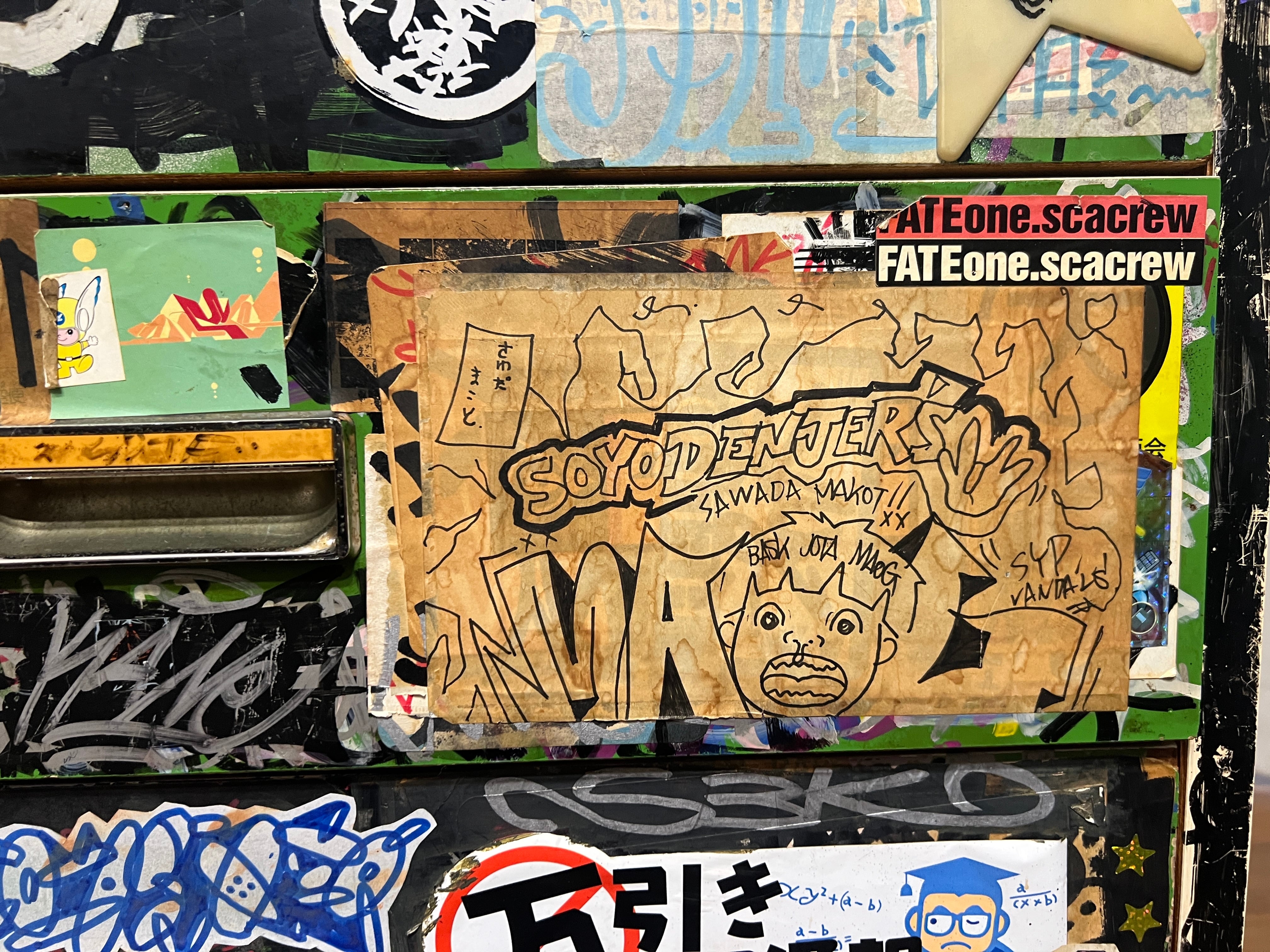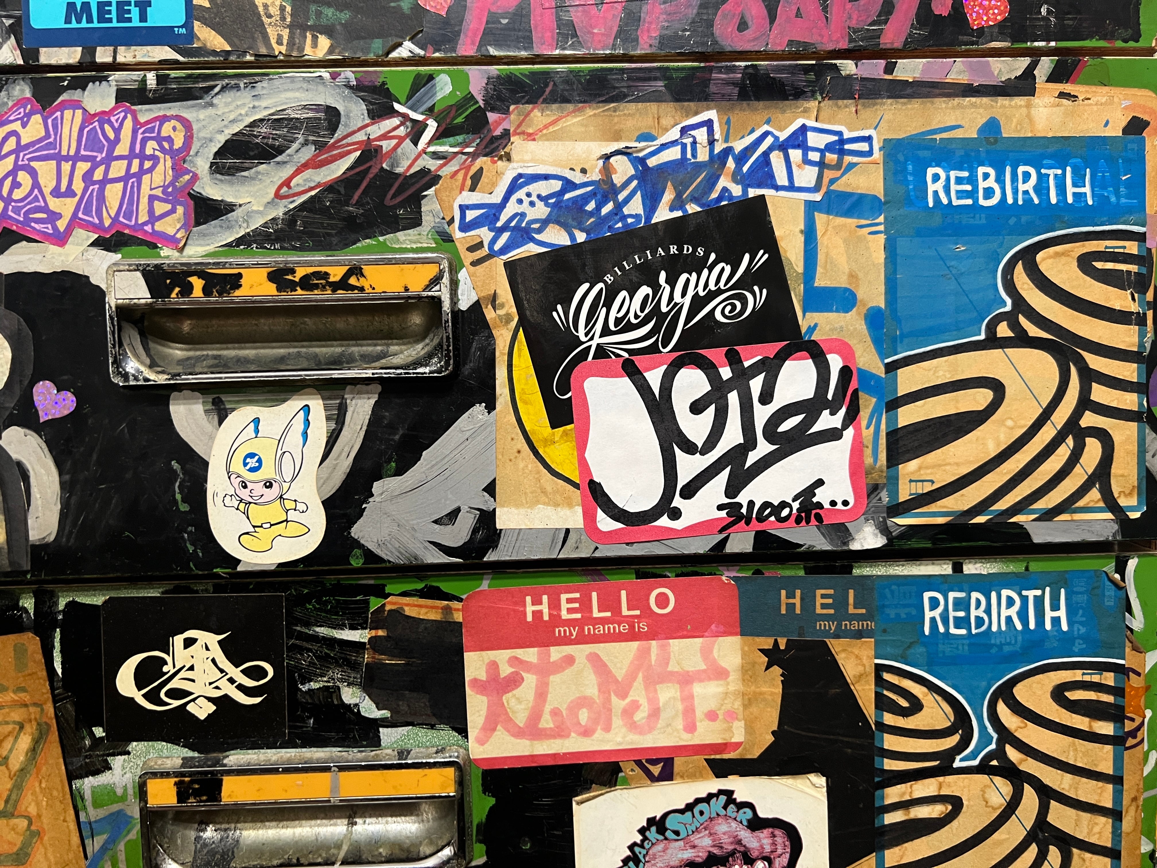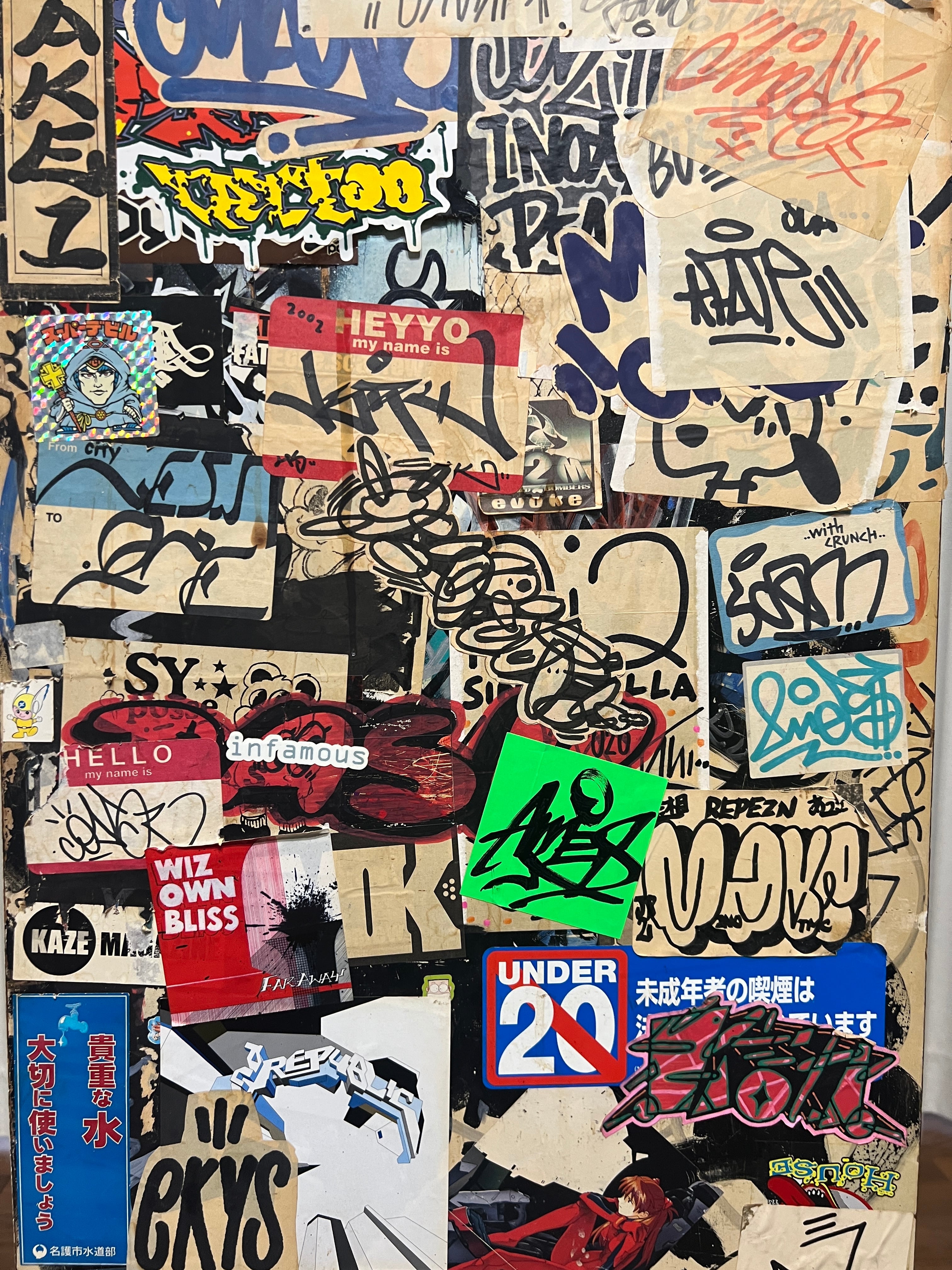 今や街の至る所に様々な種のステッカーがひしめき合う光景は、当たり前の風景になりつつある。しかしながら日本におけるステッカーボムの原点はGRAFFITI ライターだと断言する。(相葉)